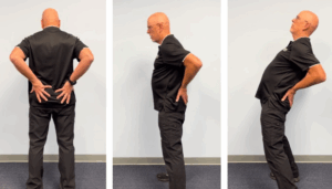 To start, stand straight with your feet shoulder width apart. Next, place your hands on your pelvis. Your palms should rest slightly above your glutes. Once you are in position, slowly lean back over your hands until you feel a stretch, and then return to the starting position. (Note: As you lean back, you may notice a bit of discomfort. If you have pain from this stretch, you’re leaning too far back!)