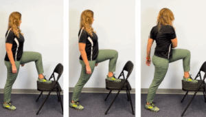 If you have a staircase, this exercise can be performed at the bottom of the staircase. Otherwise, grab a sturdy chair and place it in front of you with the seat facing towards you. To begin, stand a few feet from your surface with your feet shoulder width apart. Keep your core tight by sucking in your belly.