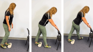 For this stretch, you’ll want to start near a table, countertop, or other stable surface. You will also want a rolled-up towel. This towel will angle your foot to increase the stretch.